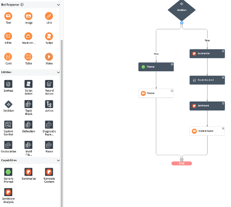 Then, capabilities come into action. You can use one or a combination of these capabilities to reach the final result based on the collected input and decisions. The content can be displayed to the user or captured in a record, such as an incident or any other relevant record.