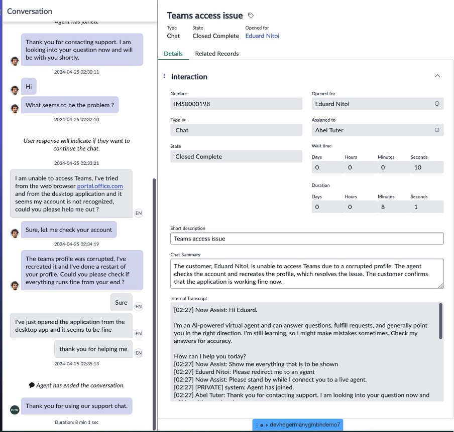 The provider of this functionality is the same Now LLM, the transcript is read from the interaction and the output is a condensed summary of the entire conversation while the core points are kept.