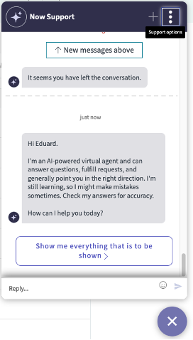 When Now Assist on Virtual Agent is activated, the chat support receives new branding. It looks different and clearly indicates that Now Support is in charge.