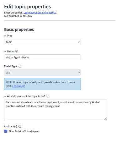 The official goal for this enhanced version of the VA is: “Now Assist capabilities bring generative AI to Virtual Agent. Using LLMs for topic discovery simplifies the amount of setup and configuration required for Virtual Agent. Topics that use keyword and Natural Language Understanding (NLU) discovery often require months of development and the involvement of dedicated subject matter experts. Unusual issues or questions may lead a user to contact a live agent instead.”