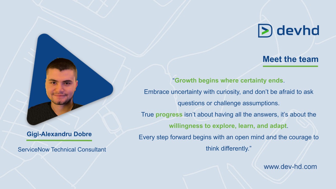 Introducing Gigi-Alexandru Dobre, one of our naturally skilled ServiceNow Technical Consultants at Devhd. From his university days at Politehnica University of Bucharest, Alex discovered his passion for technology and the...Continue reading→